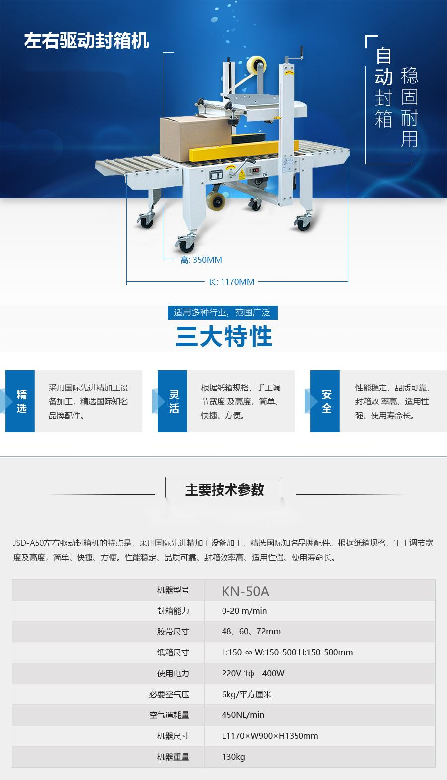 KN-50A全自動折蓋封箱機兩側(cè)皮帶驅(qū)動,采用即貼膠帶封口,全自動折蓋上下速,平穩(wěn),且封箱效果平整、規(guī)范、美觀,可根據(jù)紙箱規(guī)格,,自動調(diào)節(jié)寬度與高度,簡單,快捷,方便,可替代人工,提高高達(dá)80%的生產(chǎn)效率.,節(jié)省5-10%耗材,是企業(yè)節(jié)省成本,提高生產(chǎn)效率,實現(xiàn)包裝標(biāo)準(zhǔn)化的好選擇。這款全自動折蓋封箱機又稱為自適應(yīng)全自動封箱機,根據(jù)紙箱尺寸大小自動調(diào)整,如需要手動調(diào)整紙箱大小尺寸,建議選用手工折蓋封箱機(手動調(diào)整)。